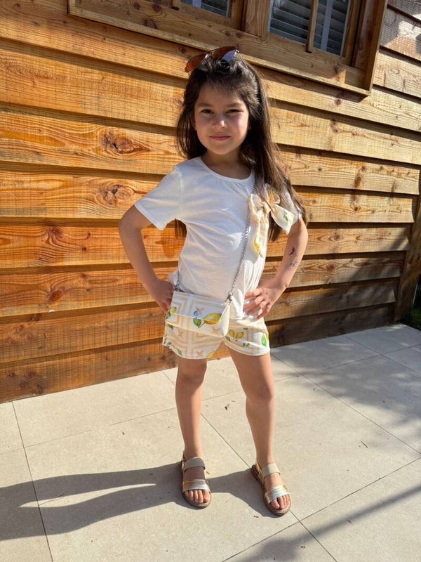 Dit stijlvolle 3 delige setje combineert comfort met een vrolijke uitstraling. De zachte t-shirt heeft een grote strik op de borst die perfect past bij de short en het schattig tasje met ketting. De short heeft een elsatische tailleband voor een fijne pasvorm en veel bewegingsvrijheid - ideaal om er in te spelen en leuk uit te zien. Leuk om te dragen op vakantie,naar een feestje of gewoon op een zomerse dag.