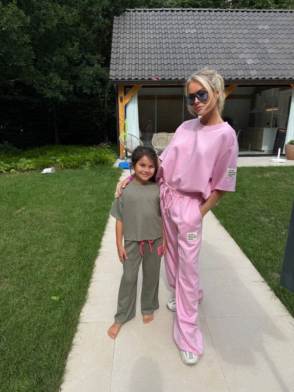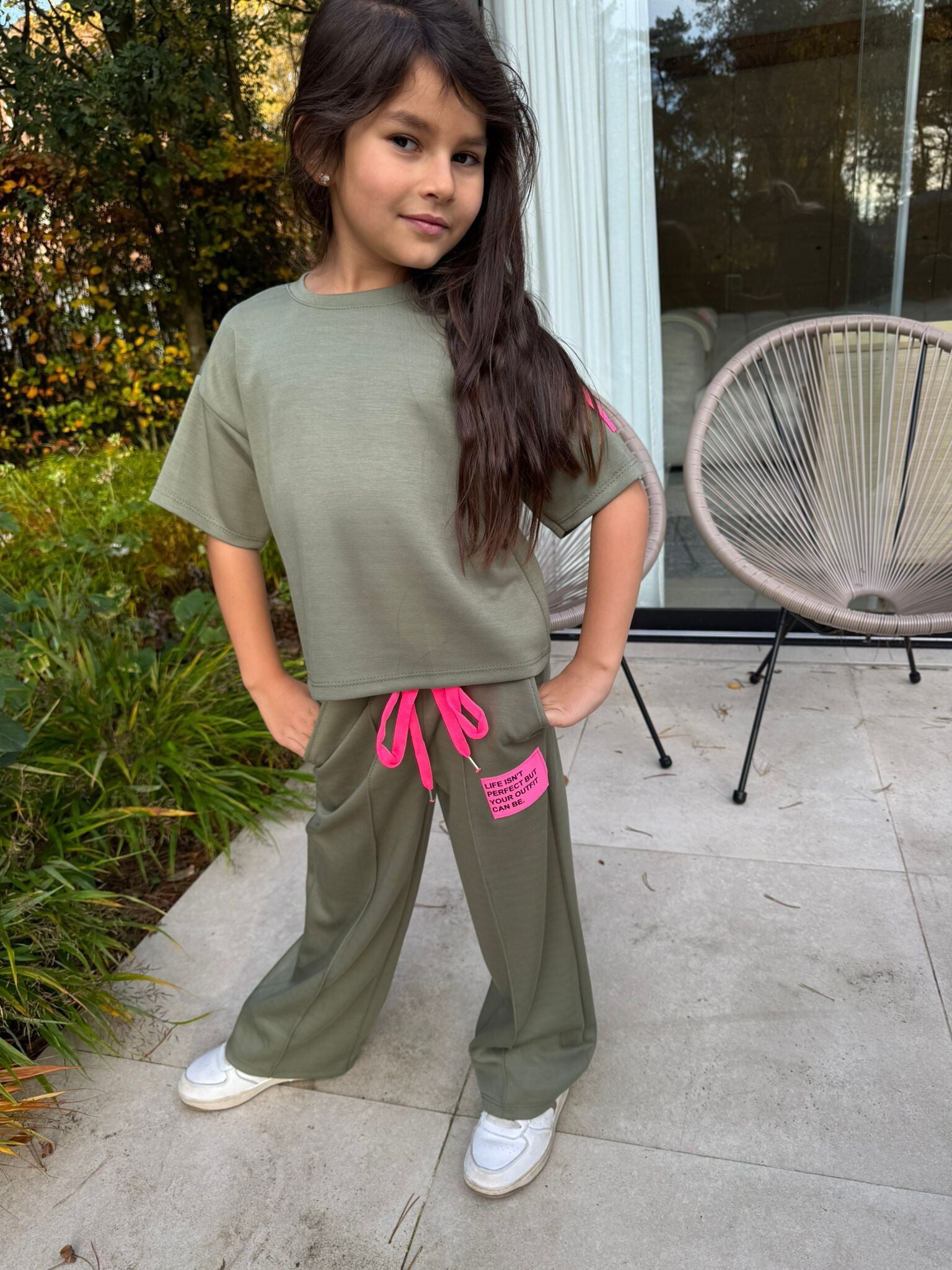 Deze tweedelige kinderset is perfect voor kids die houden van comfy outfits met een trendy touch. De set bestaat uit een zacht t-shirt met korte mouwen een een comfortebele jogingbroek met elastische taille en opvallende roze trekkoord.